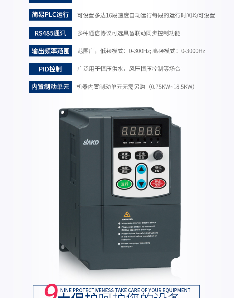 ⊙提供多種故障保護(hù)功能:過流、過壓、欠壓、過溫、缺相、過載等保護(hù)功能