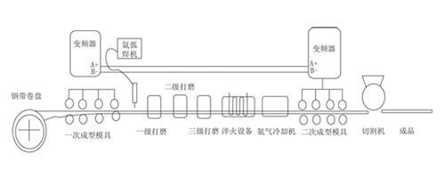 半成品不銹鋼帶整卷放置在放卷機架上面(被動放卷),在1#變頻器驅動下,鋼帶通過一次成型模具(多個模具)將鋼帶逐級卷成管狀,通過下一個環(huán)節(jié)---氬弧焊接設備對著閉合口進行連續(xù)不斷的焊接。然后進入三級加濕打磨將焊接點打磨光潔無痕。淬火使不銹鋼材質變得更加適應各種惡劣場合。又通過第二次成型還可對成品直徑進行校正,保證產品的合格率。最后根據要求將不銹鋼管通過切割成不等長度的成品。