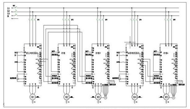 目前行業(yè)常用的方案:卷繞張力由磁粉離合器或力矩電機控制,第一、二次放卷張力由磁粉制動器控制。烘爐段的張力控制主要是通過浮動輥電位器檢測速度偏差,通過電位器或通過同步控制板手動調(diào)節(jié)復合電機和涂膠電機的速度同步來維持恒定的張力。